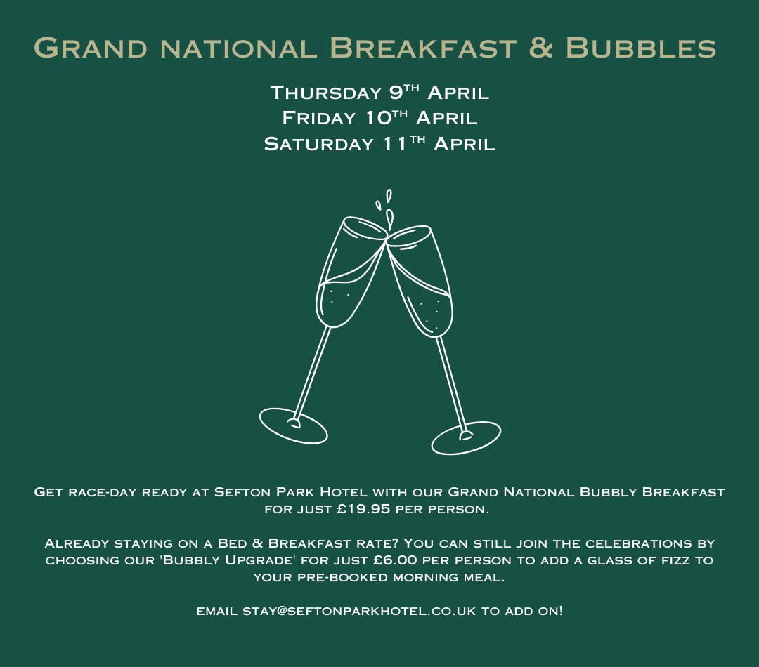 Get race-day ready at Sefton Park Hotel with our Grand National Bubbly Breakfast for just £19.95 per person. It’s the perfect way to fuel up with a hearty breakfast and a chilled glass of fizz before heading to Aintree.
