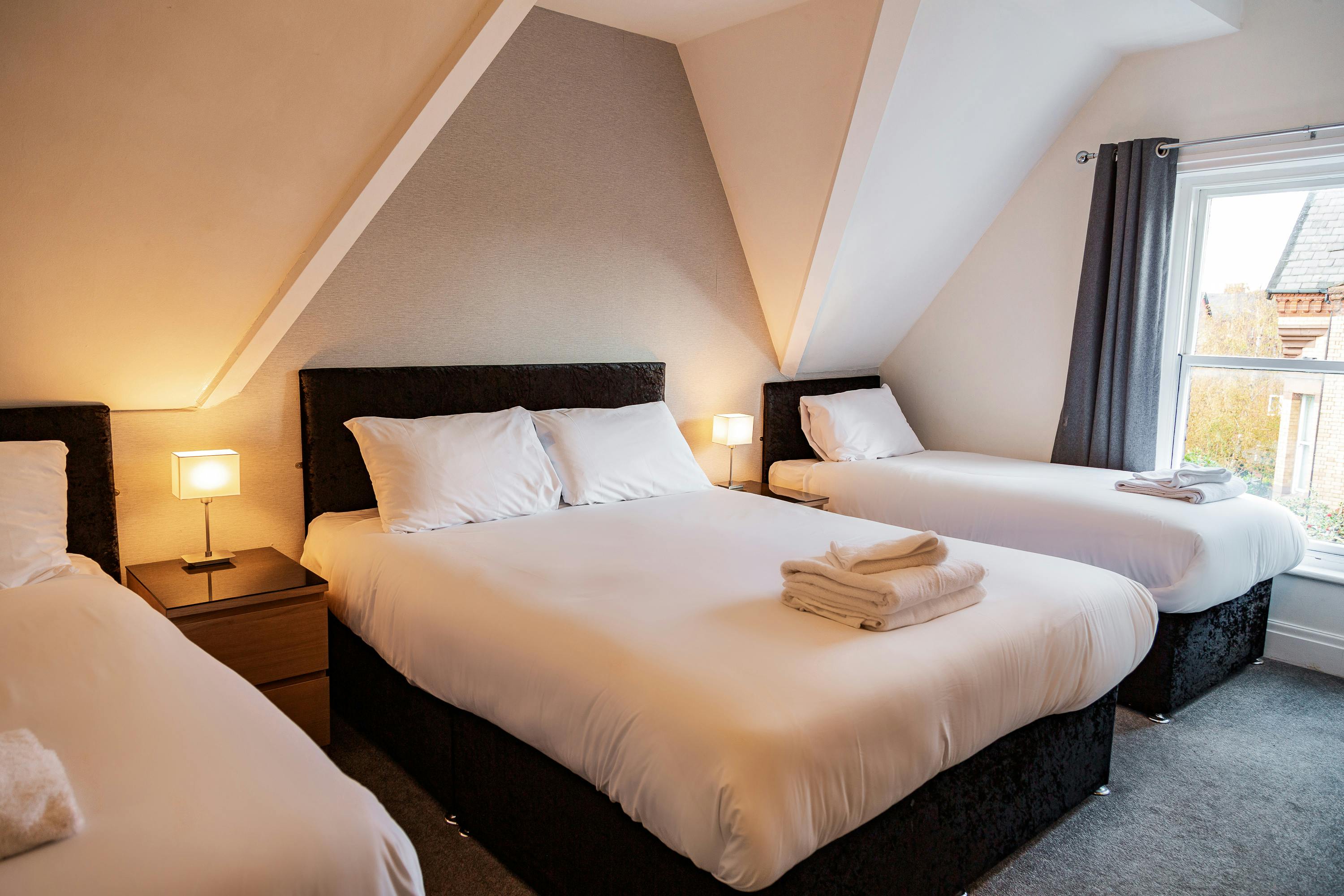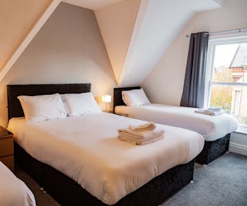 Designed for families or groups traveling together, our Quad Rooms offer a spacious layout featuring one double bed and two single beds. Each room comes fully equipped with an ensuite bathroom, tea and coffee making facilities, TV, and free WiFi. Please note that while all our rooms provide a comfortable stay, several of our quad rooms have been recently refurbished to offer a fresh, modern finish.